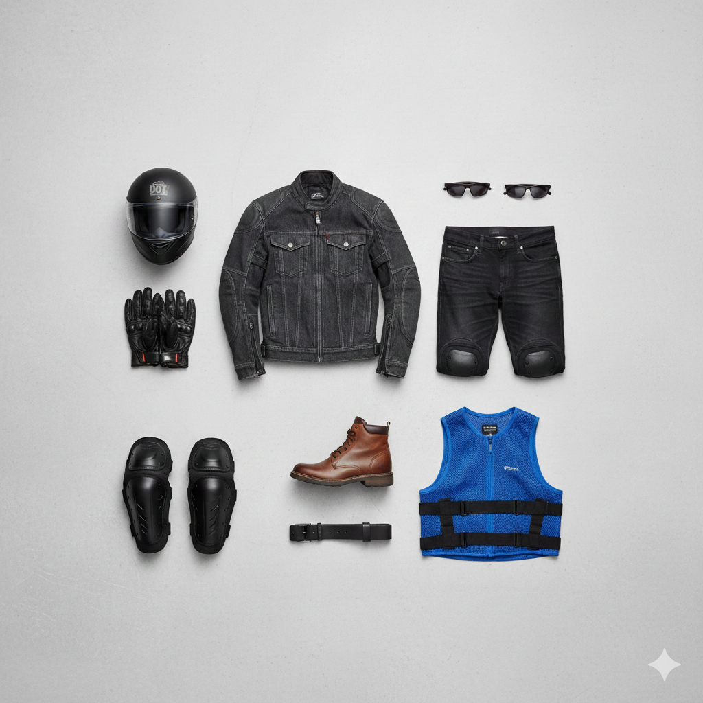 Helmet, jeans, boots, gloves, and a full-sleeve shirt or jacket.